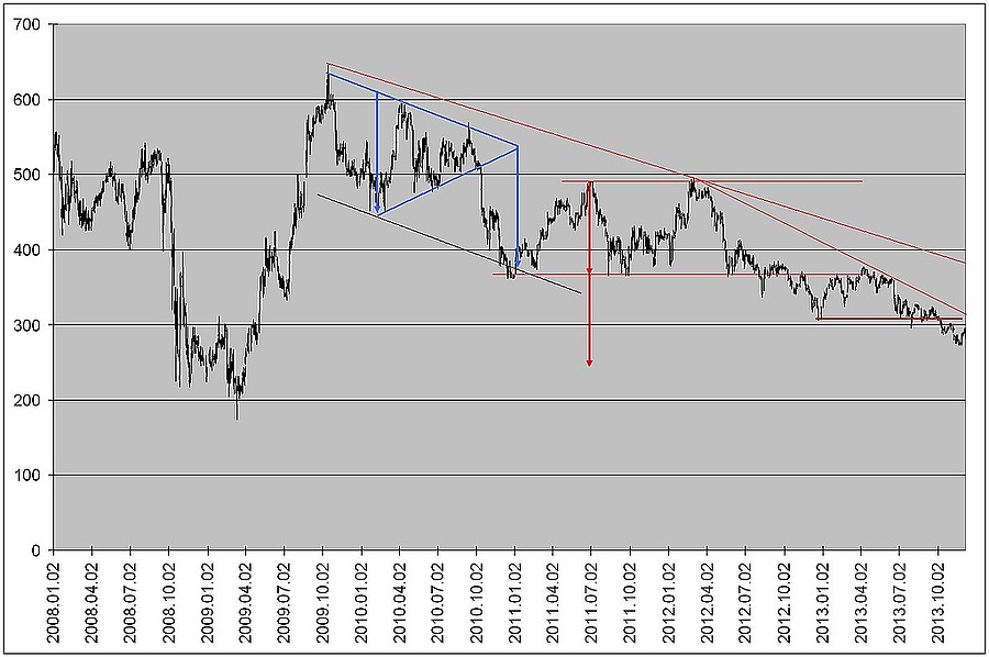 Az eredeti grafikonon is látszik, hogy a távközlési részvény árfolyama durva csökkenő trendben van, újabb és újabb mélypontokat üt, miközben nem képes magasabb csúcsokat csinálni, azonban a korrigált grafikonon egy alakzat is feltűnik, ami az eredetin nem. Ez pedig egy elég jól kirajzolódó sávozás vagy négyszög alakzat, amely mintegy másfél év alatt rajzolódott ki, nagyjából 365 és 490 forint között, s amely már jó egy éve letört. Ennek céláraként a jelenleginél alacsonyabb, 230-245 forintos célárfolyam adódik a részvények számára.