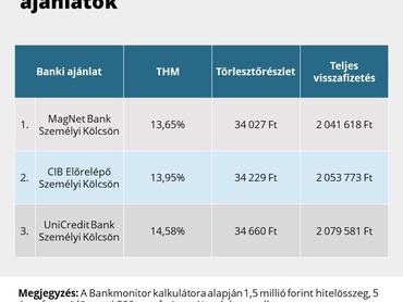 Ez az összehasonlítás THM szerint rendezve a legjobb 3 banki terméket mutatja. Eszerint a legkedvezőbb személyi kölcsön ajánlat jelenleg a MagNet banknál érhető el, már 34 ezer forintos havi törlesztőrészlettel.