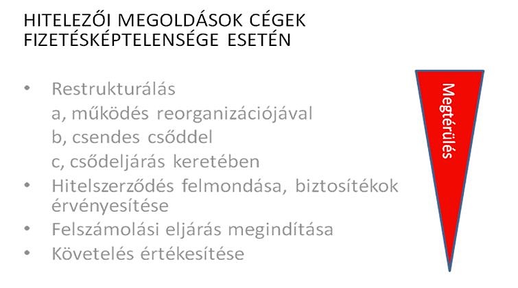 A PSZÁF adatai szerint Magyarországon folyamatosan, és nagymértékben romlik a vállalatok hiteltörlesztési fegyelme: míg a 90 napon túli hátralékok teljes hitelállományra vetített aránya tavaly félévkor 12,9 százalék volt, az év végére elérte a 14,4 százalékot, idén júniusra pedig már a 17,6 százalékos szinten állt. Időben történő beavatkozás nélkül az eladósodott vállalatok jelentős része kilátástalan finanszírozási helyzetbe kerül, többségükre végül csődeljárás, felszámolás vár.