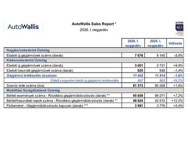 Tíz százalékkal több új gépjárművet értékesített az AutoWallis csoport kiskereskedelmi üzletága 2026 első negyedévében, mint egy éve ugyanekkor. A cégcsoport összesített adatai viszont 2 százalékos átmeneti megtorpanást mutatnak ebben az időszakban a nagykereskedelmi üzletág 6 százalékkal csökkenő értékesítési darabszámainak köszönhetően.
