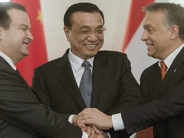 Ivica Dacic szerb, Li Ko-csiang kínai kormányfő és Orbán Viktor miniszterelnök (b-j) kezet fog, miután a Budapest-Belgrád vasútvonal korszerűsítése érdekében kezdődő együttműködésről állapodtak a Bukarestben zajló Kelet-Közép-Európa (KKE)-Kína csúcstalálkozón 2013. november 25-én.