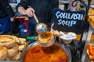 Ételes bódéból most is rengeteg van: gőzölgő lábasok, rotyogó pörköltek, csillogóra lakkozott kürtős kalácsok – minden a klasszikus adventi vásárélményt hozza, csak éppen főként külföldi közönségnek. Ami érthető, hiszen végignézve az árlistákat azonnal láthatjuk, ez bizony nem az átlag magyar pénztárcájának való.