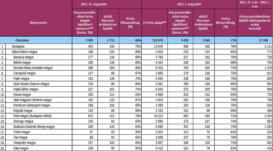 A kvóták kihasználtsága19-ből 13 megyében (plusz még Budapesten is) nőtt, mindössze három megyében mért visszaesést, vagy stagnálást a PSZÁF. Ebben a tekintetben Hajdú-Bihar megyével holtversenyben Budapesten mérték a legmagasabb (76 százalék) arányokat, míg őket Jász-Nagykun-Szolnok (75 százalék), Borsod, illetve Somogy megye követ, ez utóbbi kettő egyaránt 74 százalékkal fért fel a dobogóra. A kényszerértékesítéstől a legfrissebb statisztikák szerint Tolna és Zala megyében kell a legkevésbé félni, ott "mindössze" a kvóta 61 százalékát használták ki az érintettek, de nem sokkal rosszabb a helyzet Heves megyében sem, ahol 63 százalék ez az arány.