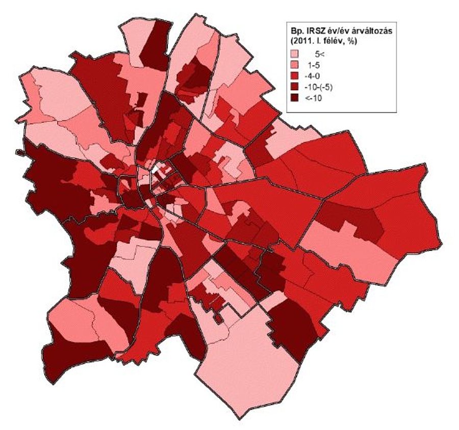 A budapesti irányítószám-körzeteket vizsgálva ugyancsak változatos kép látható: 31 körzet - ebből 13 budai - átlagára csökkent 10 százalékot meghaladóan, míg 11 körzet esetében legalább ilyen mértékű a növekedés, s ezek közül mindössze a 1038-as van a budai oldalon.