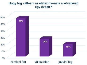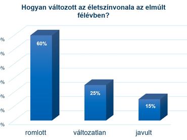 A válaszadók 60 százalékának romlott az életszínvonala az utóbbi félévben, minden negyedik ember érzi úgy, hogy változatlan körülmények között él, 15 százalék pedig úgy vélte; jobb anyagi helyzetben van, mint korábban – derül ki az Aegon, Magyarország vezető biztosítójának legújabb, reprezentatív kutatásából. A magyarok borúsan gondolkodnak a jövőt illetően: 56 százalék vélekedik úgy, hogy tovább romlik majd az életszínvonala, 26 százalék bízik a javulásban és közel minden negyedik szerint semmi sem változik majd.