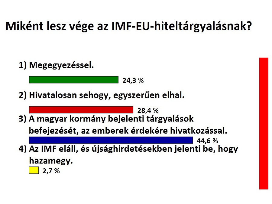 A Napi Gazdaság mai, Finanszírozás, versenyképesség, növekedés című makrogazdasági konferenciájának résztvevőinek túlnyomó többsége - háromnegyede - számít arra, hogy megegyezés nélkül érnek véget a hivatalosan még el sem indult IMF-EU-hiteltárgyalások, a megállapodást várók aránya nem éri el a 25 százalékot. A megegyezés nélküli végeredményre számítók között közel kétszer annyian vannak azok, akik szerint a magyar kormány fogja bejelenteni a tárgyalások végét, mint azok, akik az egyeztetések elsorvadását várják. Néhányan azt az abszurd verziót sem tartják kizártnak, hogy az IMF követi a magyar kormány példáját, és újsághirdetésben kommunikál majd.