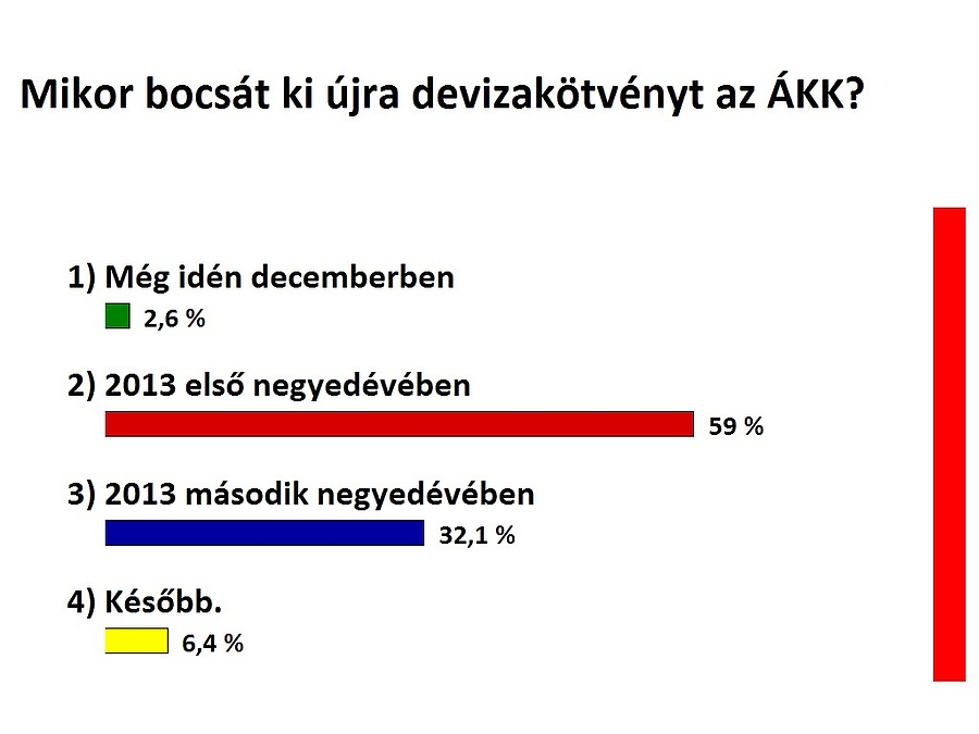 A konferencia közönsége vette az első előadó, Varga Mihály üzenetét: az IMF-tárgyalásokért felelős tárca nélküli miniszter jelezte, hogy az Államadósság Kezelő Központ 2013 első felében devizakötvénnyel tesztelheti majd a piacot. Ennek megfelelően rendezvényünk vendégeinek több mint 80 százaléka vár január és június között kötvénykibocsátást, harmaduk ezt a második, szűk kétharmaduk pedig az első félévre teszi.
