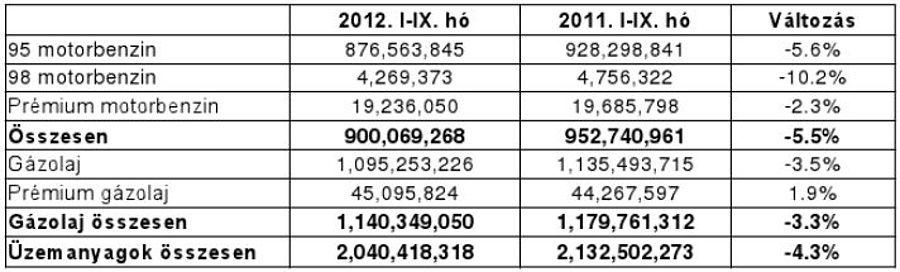 Összességében az első háromnegyed évben 2,040 milliárd liter üzemanyagot tankoltak az autósok és fuvarosok a kutakon, míg tavaly az első kilenc hónapban még 2,132 milliárd litert.