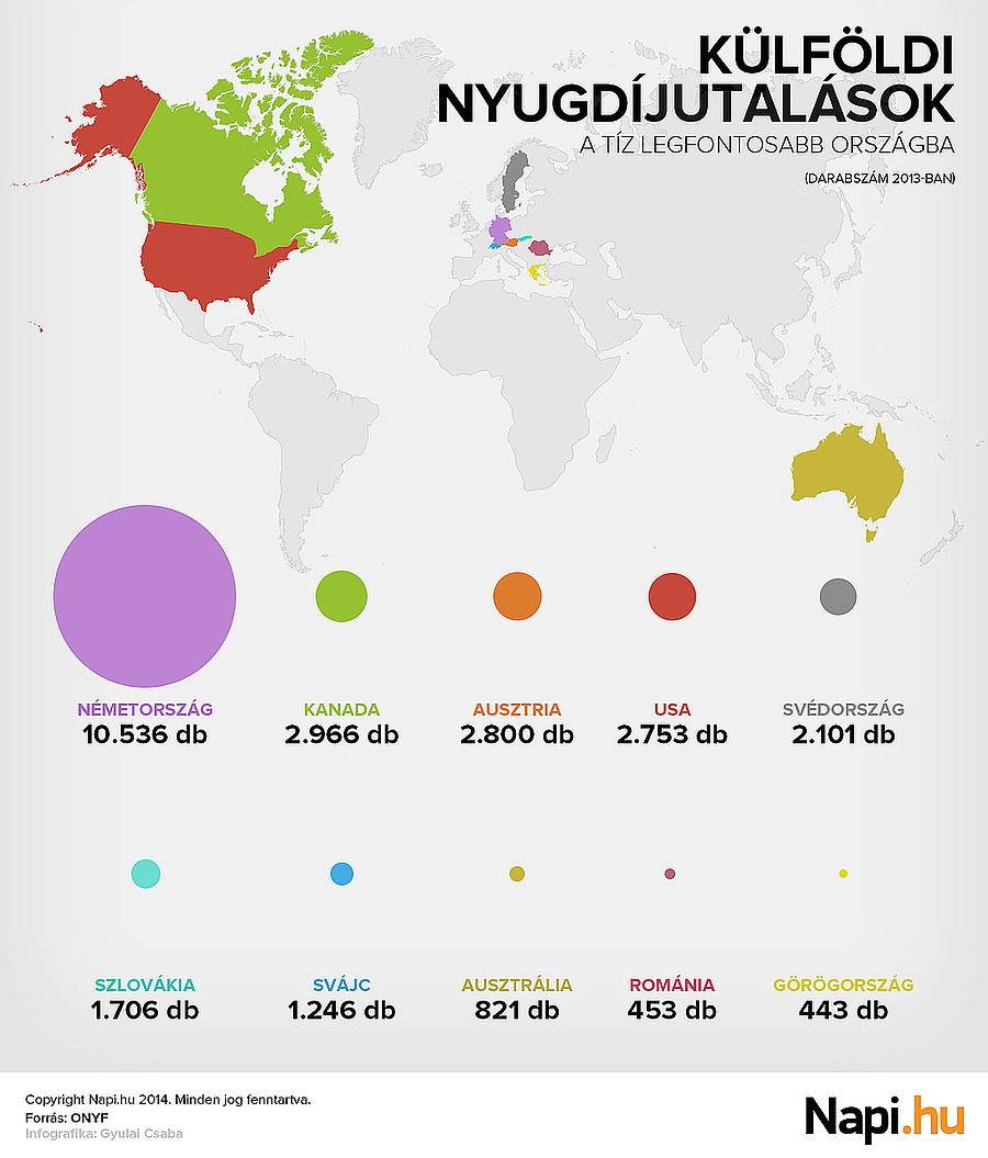 A nyugdíjbiztostó adatai szerint tavaly januárban összesen 28 951 ezer ellátást folyósítottak külföldre, szemben a 2008-as 21,5 ezer darabbal. Tavaly a legtöbb ellátás - darabszámban Németországba, Kanadába és Ausztriába ment, az USA csak a negyedik helyre került, miközben a 2008-as adatok szerint az Egyesült Államok még a második helyen szerepelt. A részletes adatokból kiderül, hogy a világ mintegy 193 országából 86 országba utalt nyugdíjat ONYF. A listán mind az öt földrész országai szerepelnek, eszerint egy "magyar nyugdíjas" él Afganisztánban, Ghánában, Jamaicában, Japánban, Líbiában, de még Oroszországba is csak egyetlen ellátást folyóst az ONYF.