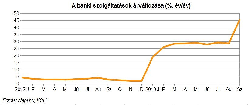 Az év kilencedik hónapjában mindez azt eredményezte, hogy az 1,4 százalékos év/év inflációt 33-szorosan meghaladó mértékben, 45,7 százalékkal (!) nőtt a KSH által máshova nem sorolt pénzügyi szolgáltatások átlagára. (A statisztikai hivatal e körben a rendszeres beszedési megbízás, a bankautomatánál történő készpénzfelvétel, az internetes átutalási megbízás díja mellett a számlavezetési díjakat is monitorozza. A második legtempósabb drágulást a fogyasztói kosárban a dohányáruk (+18,9 százalék) produkálták, a harmadik helyre a repülőjegyek iratkoztak fel.