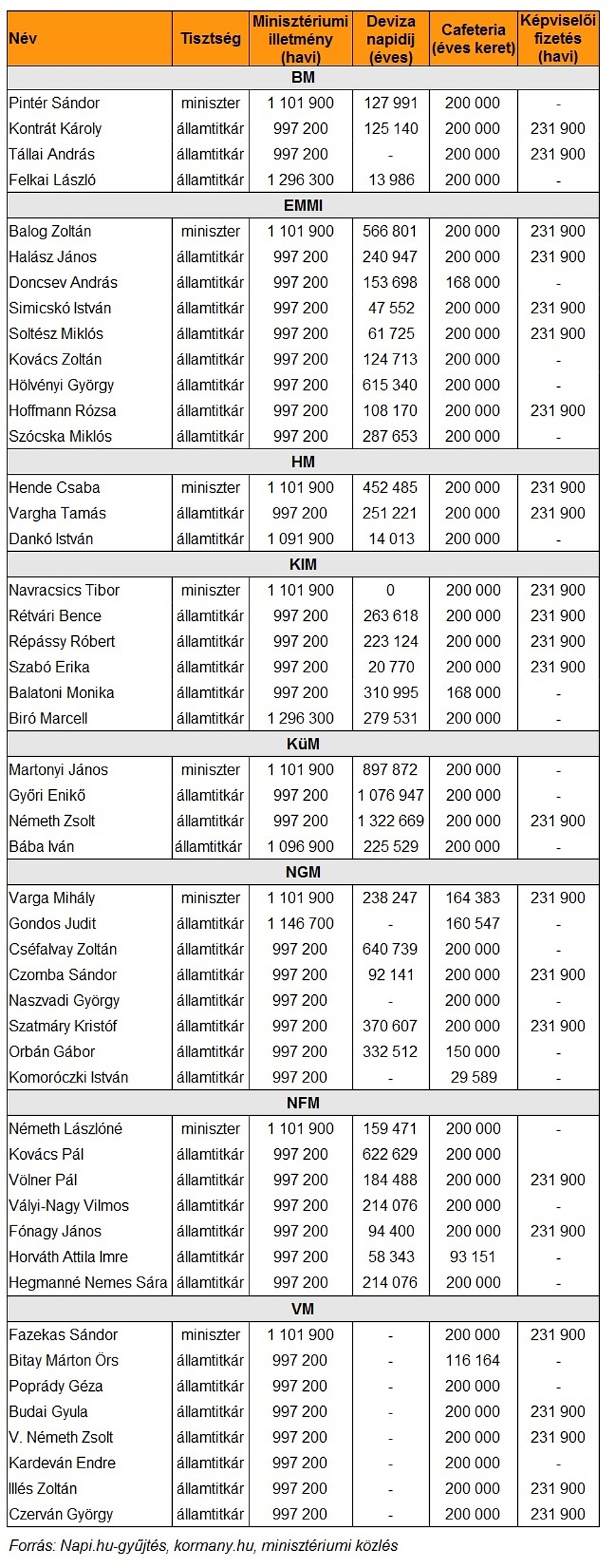 A miniszterek fizetése egységesen havi bruttó 1 101 900 forint, amihez jön még az évi 200 ezres cafeteriakeret, illetve sok esetben a 231 900 forintos parlamenti képviselői tiszteletdíj is. A képviselő miniszterek így a külföldi utak után járó napidíjak összegétől függően évi bruttó 16 millió forint körül visznek haza, míg a "sima" tárcavezetők - a már említett Németh Lászlóné fejlesztési- és Pintér Sándor belügyminiszter - 13,6 millióból gazdálkodhatnak. Martonyi János külügyminiszter sem képviselő, de az ő juttatásait a kilencszázezres napidíjtömeg vitte 14,3 millió forint fölé. (A KIM tájékoztatása szerint Navracsics Tibor miniszter a deviza napidíj juttatását 2013-ban nem vette fel.)