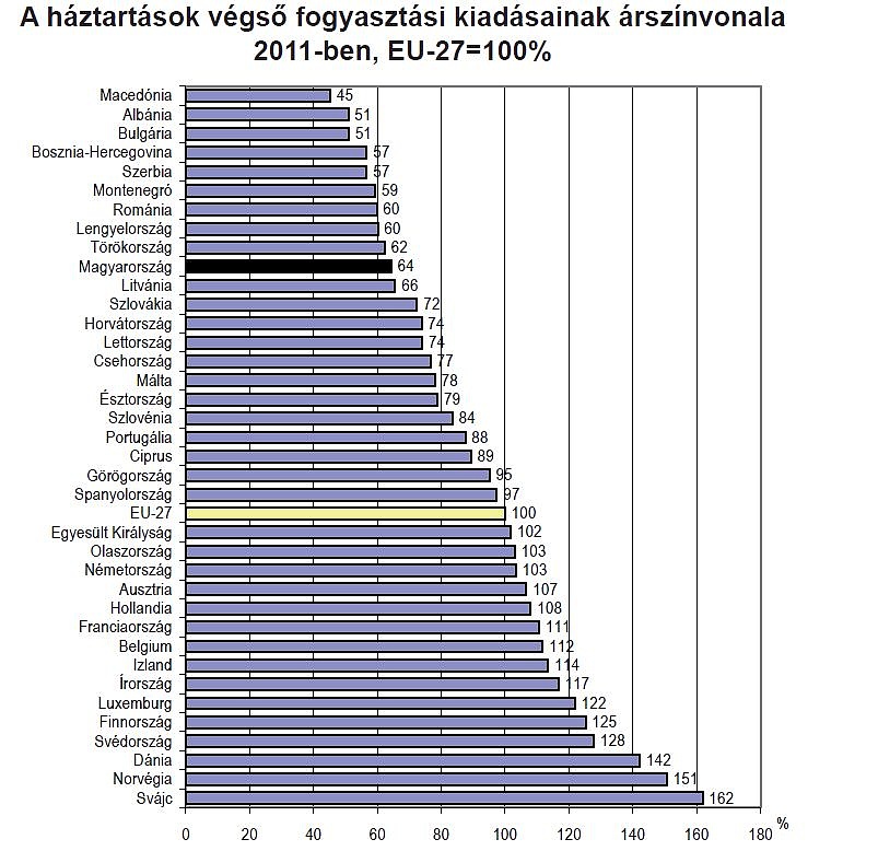 Visszatérve a 2011-es adatokra, szomszédos országok árszínvonalát tekintve Szerbia (57 százalék) és Románia (60 százalék) a magyar árszínvonal alatt maradt. Szlovákia (72 százalék) és Horvátország (74 százalék) árszínvonala kisebb mértékben, Szlovéniáé (84 százalék) és Ausztriáé (107 százalék) jelentősen meghaladta hazánkét. A listát 162 százalékos értékkel Svájc vezeti, majd Norvégia (151) és Dánia (142) következik, ami mintegy háromszorosa a sereghajtó balkáni államok (Macedónia: 45, Albánia és Bulgária: 51) átlagának.