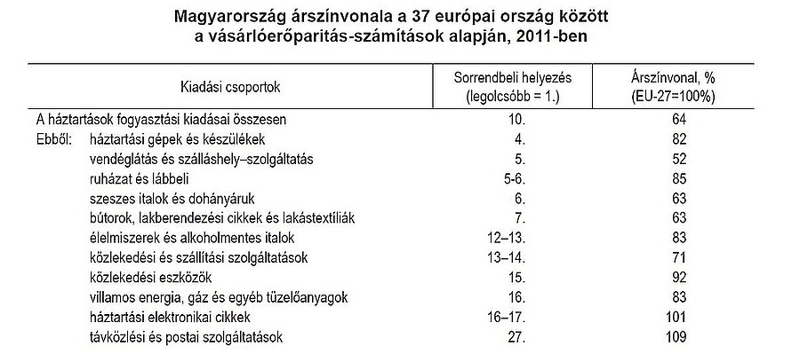 Magyarország az EU-27 átlagához viszonyított 64 százalékos árszínvonalával a viszonylag olcsónak számító alsó harmadhoz tartozik a vizsgált 37 európai állam között - ez derül ki a fogyasztási kiadások 2011-es árszínvonalát vásárlóerő-paritáson összehasonlító kiadványból. A KSH által közölt adatok szerint hazánk a 37 ország között a 10., az EU-27-ek között viszont a 4. legolcsóbb országnak bizonyult. Érdekes, hogy Magyarország távolodóban van az EU-átlagtól: 2008-ban még 70, 2010-ben pedig 66 százalékon állt.