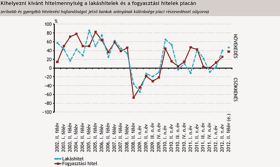 A magyarországi bankok hitelezési gyakorlatát vizsgáló, ez év júliusában is elvégzett jegybanki felmérés megállapítja, hogy 2012 második negyedévében a háztartási hitelek feltételei enyhültek mind a lakás-, mind a fogyasztási hitelek esetében. A bankok nettó értelemben vett 25 százaléka enyhített a hitelezési feltételeken, ami elsősorban a magasabb megengedett jövedelemarányos törlesztőrészletben és hitelfedezeti mutatóban (LTV), illetve az alacsonyabb kamatfelárban jelentkezett, amivel némi korrekció történt a 2011 végi széles körű szigorításokban.