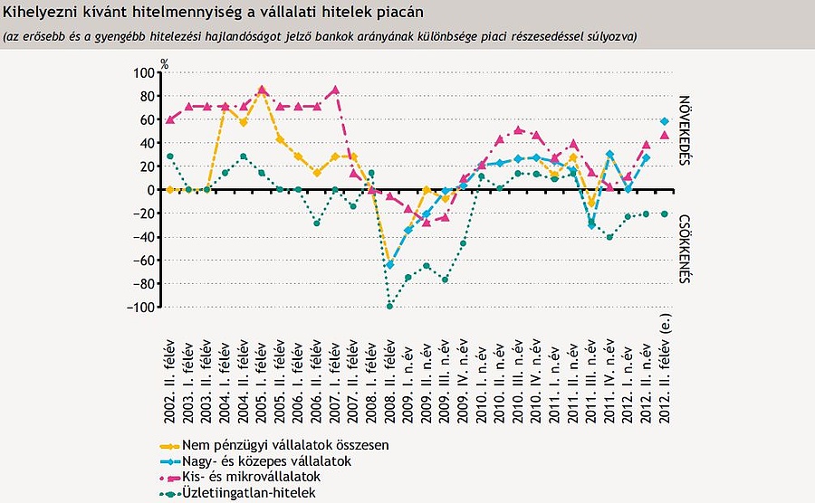 A vállalati szegmensben − a háztartási hitelekkel ellentétben − nem számoltak be korrekcióról, a korábbi negyedévekhez hasonlóan további szigorítások figyelhetők meg a hitelezési feltételekben 2012 második negyedéve során.. A bankok nettó értelemben vett mintegy 30 százaléka jelzett szigorítást a nagy- és közepes vállalatok, illetve a kis- és mikrovállalatok esetében egyaránt, amely az előző negyedévi adatokhoz képest nagyobb arány. A szigorítások a minimálisan megkövetelt hitelképességi szintben, a magasabb kamatfelárban és kockázati prémiumban jelentkeztek, de történtek szigorítások a hitel és hitelkeret nyújtásáért felszámított díjakban és az adatszolgáltatási követelményekben is.