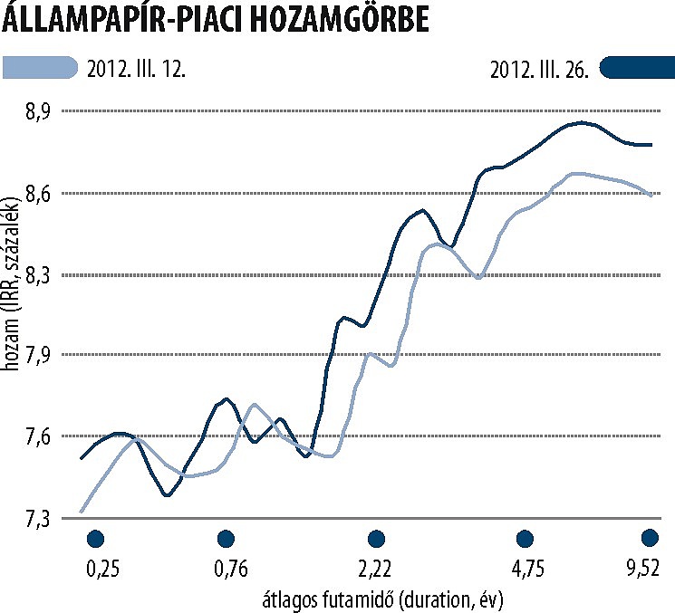 A hazai állampapírpiac pedig nem is tehet mást, mint az éppen aktuális helyzetre reagál − pozitívan az esélyek növekedésére, negatívan pedig a csökkenésére. A csütörtöki kötvényaukciók idején elég pesszimista volt a hangulat, így a hozamok jelentősen emelkedtek az előző napi másodpiaci referenciaértékekhez képest. Mindhárom kötvénysorozat hozamszintje a 8-9 százalékos tartomány felső felébe esett, a hosszabb futamidőknél magasabb értékekkel. Ugyanakkor a kereslet nagyságára nem lehet panasz, a hároméves sorozatból mennyiségi emelés is történt, s komoly tételek keltek el a délutáni átlagáras, úgynevezett nem kompetitív értékesítés keretében is.