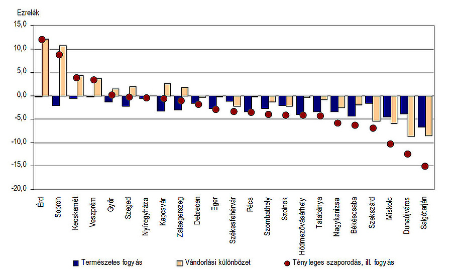 Békéscsaba, Debrecen, Dunaújváros, Eger, Érd, Győr, Hódmezővásárhely, Kaposvár, Kecskemét, Miskolc, Nagykanizsa, Nyíregyháza, Pécs, Salgótarján, Sopron, Szeged, Székesfehérvár, Szekszárd, Szolnok, Szombathely, Tatabánya, Veszprém, Zalaegerszeg.Jól mutathatja a város népszerűségét és az általa nyújtotta lehetőségeket az el- és bevándorlás: 2001 és 2010 között a legtöbben Érdre és Sopronba költöztek, de szintén vonzónak bizonyult Kecskemét és Veszprém, míg sok salgótarjáni, dunaújvárosi lakos gondolta úgy (ezer lakosra vetítve több mint nyolcan), hogy máshol találhatja meg a számításait.