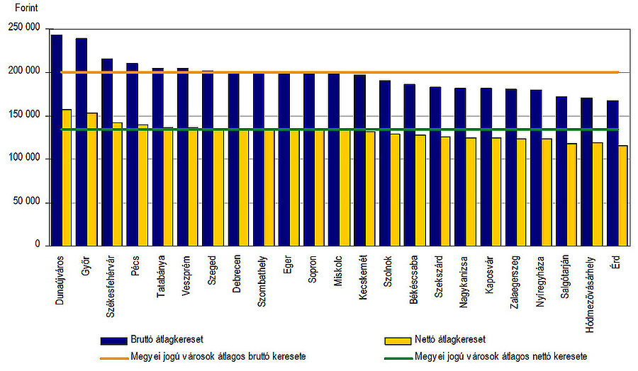 Amennyiben nem számítjuk Budapestet, úgy az országos átlaghoz (bruttó 175 ezer forint) képest 25 ezer forinttal kerestek többet a megyei jogú városokban, kivételt mindössze Érd, Hódmezővásárhely, és Salgótarján jelentett. Két évvel ezelőtt a legtöbb bért, 243 ezer forintot Dunaújvárosban lehetett keresni, a legrosszabb helyzetben pedig az előbb már említette Érd volt a maga 167 ezer forintjával. A település kedvezőtlennek tűnő helyzete sajátos területi és gazdasági helyzetéből adódik: itt dolgoztak legkevesebben, mindössze 6600 fő teljes munkaidős állt alkalmazásban, az átlagosnál kevesebb és kisebb létszámú vállalkozás működött, a lakosság jelentős része pedig a fővárosba járt dolgozni. Amennyiben azt nézzük, hogy 2010-ben az előző évihez képest hol nőtt a leginkább a fizetés, úgy Miskolcot, Hódmezővásárhelyet és Dunaújvárost találjuk a képzeletbeli dobogón.