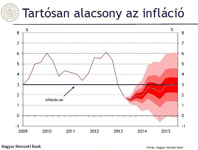 Ma már látható, hogy az EU megindult a japán úton - fogalmazott Matolcsy. Ma az EU legkockázatosabb forgatókönyve, hogy megismétli a hosszas stagnálást. A deflációt sokkal nehezebb kezelni, mint az inflációt. Nem lenne szabad megismételni a japán deflációs évtizedet. Az ECB megelőzte az eurózóna összeomlását, ám monetáris eszközökkel nem lehet dinamikus növekedési pályára állni, fiskális eszközökre van szükség az Európai Unióban. Az uniónak van egy tartaléka, az infláció, az inflációs célt 2-4 százalékra kell felemelni, ennek nincs kockázata - vélekedett az MNB elnöke.
