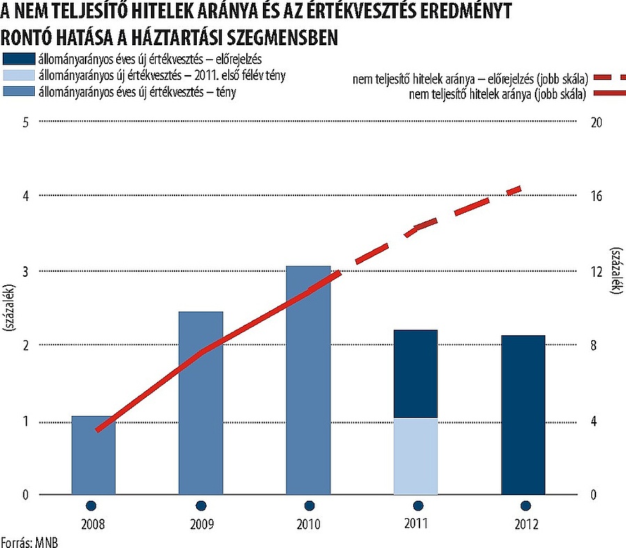 Idén az első félévben a háztartási hitelekre képzett értékvesztés elmaradt a 2010 azonos időszakában látottól. Ennek megfelelően az értékvesztés eredményrontó hatása az állomány arányában 2,5 százalék alá csökkent. Az értékvesztés eredményt rontó hatásának mérséklődésekor ugyanakkor figyelembe kell venni, hogy a júniusi adatok nem tartalmazzák a svájci frank július−augusztusi erősödésének hatását.