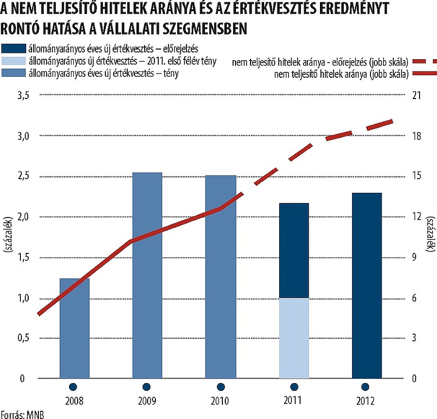A jegybank már a korábbi stabilitási jelentéseiben is jelezte: amennyiben a magyar gazdaságban nem következik be érdemi javulás, akkor a bankoknak jelentős veszteségei keletkezhetnek a kereskedelmi ingatlanhiteleken, mivel ezeket nem lehet a végtelenségig újra és újra átstrukturálni. A romló gazdasági kilátások következtében a nem teljesítő hitelek aránya a vállalati szegmensben az előrejelzési horizonton nem tetőzik. Az MNB várakozásai szerint a vállalati nem teljesítő arány 2011 végére 17,5 százalékra emelkedhet, 2012 végére pedig elérheti a 19 százalékos szintet.