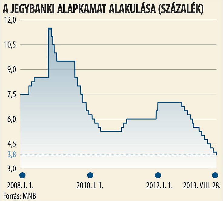 A Magyar Nemzeti Bank monetáris tanácsa - a 10 bázispontos csökkentést valószínűsítő elemzői várakozásokra rácáfolva és az eddigi 25 bázispontos lépések folyamatát megszakítva - 20 bázisponttal 4,00 százalékról 3,80 százalékra csökkentette szerdai hatállyal az alapkamatot. A 13. egymást követő vágással a tavaly augusztusi 7,00 százalékról vitte le az alaprátát a testület, azaz egy év alatt gyakorlatilag megfelezték a kamatot.