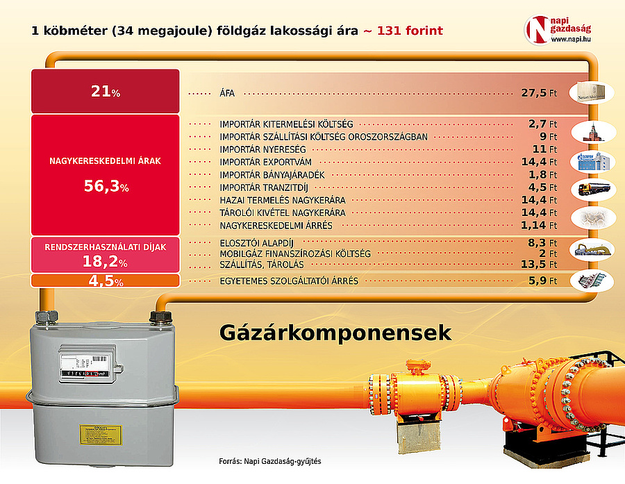 A bányajáradék, exportvám és nyereségre jutó osztalék fele révén az orosz költségvetésbe kerül a 131 forintból közvetlenül legalább 17 forint, a számlaösszeg 13 százaléka. A kitermelés közvetlen költsége mindössze a számla végösszegének alig több mint 2 százalékára rúg, ehhez jön még azonban az oroszországi, durván 3400 kilométeres szállítás költsége és a nyereség, így összességében valamivel több mint 22 forint a Gazpromhoz kerül a 131 forintos köbméterenkénti árból, ami annak körülbelül 17 százaléka.