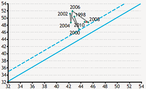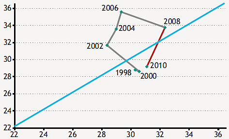 A következő választási évre, 2002-re, a tőke- és folyóegyenleg egyaránt az 1998-as szintre esett vissza, ugyanakkor a kamatkifizetések ekkor további csökkenést tudtak felmutatni. Két évre rá a folyótételek romlásával együtt ugyan konszolidálódott, azonban 2006-ra a korábbi szinteknél magasabbra ugrott a deficit. A kiemelkedően magas hiány azonban 2008-ra olvadásnak indult, még úgy is, hogy a kamatkiadás kis mértékben növekedett és a válság hatására a bevételek is csökkentek.