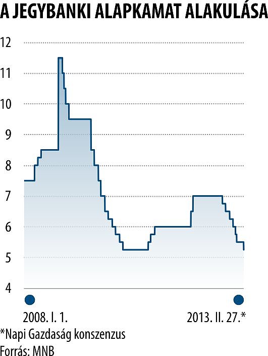 Kedden folytatódik az MNB kamatcsökkentési ciklusa − vélik egyöntetűen a lapunk által megkérdezett elemzők. A monetáris tanácsnak (MT) ráadásul mostantól több érve lesz a vágásra, hiszen meglepően gyenge lett a GDP-adat és váratlanul nagyot zuhant az infláció. A konszenzus szerint 2013 végéig 4,5 százalékig süllyedhet a ráta, és az elemzők többsége ezen a szinten tartja reálisnak a ciklus végét, vagyis jövőre is átlagosan ilyen kamattal számolnak. A mostani kamatdöntésnél meglepetés nem várható − fogalmazott Árokszállási Zoltán, az Erste Bank Zrt. elemzője, aki azon lepődne meg, ha megakadna a tavaly augusztus óta tartó kamatcsökkentési sorozat. A 25 bázispontos vágással a tanács beállítaná a 2010-ben elért "mélypontot".