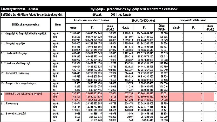 A FESZT elnökségi tagja emellett az Országos Nyugdíjbiztosítási Főigazgatóság (ONYF) számaira hivatkozva arra mutatott rá, hogy az öregségi nyugdíjkorhatár alatti rokkantnyugdíjasok körében 337 530 rokkantsági nyugdíjról beszélhetünk, akiknek az átlagos havi rokkantsági nyugdíja 70 051 forint, amelyen belül a férfiaknál átlag 75 706, a nőknél 64 558 forint a rokkantsági nyugdíj. Továbbá mintegy 100 ezer rokkantsági nyugdíjasnak van 30-39 év szolgálati ideje. (A rokkantsági nyugdíj szociális ellátássá, illetve szociális járadékká alakítása a szolgálati idő alatt befizetett járulékok alapján szerzett rokkantsági nyugellátás miatt megsértené a parlament által ratifikált ENSZ-egyezményt a fogyatékossággal élő személyek jogairól is.)