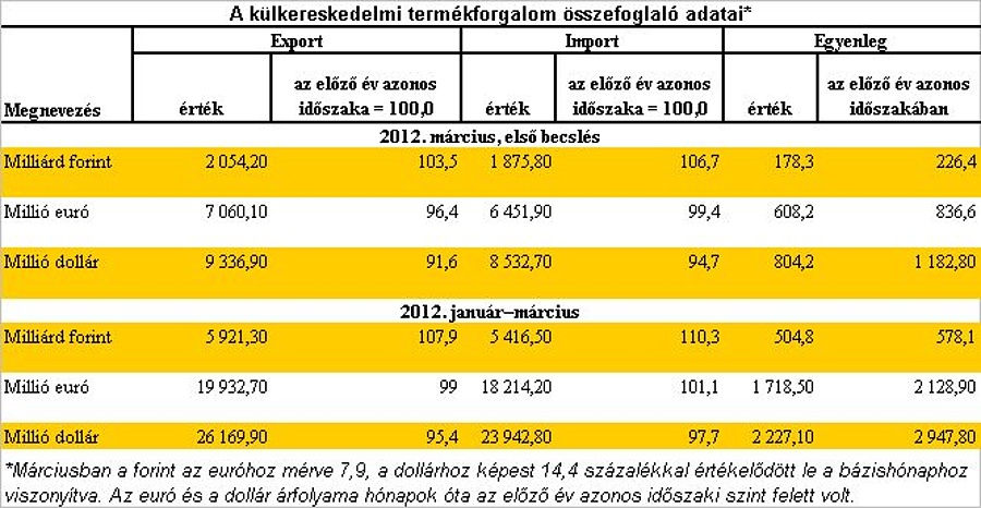 Idén márciusban már csak a forintban mért kiviteli adatoknál tudott bővülést kimutatni a KSH. A harmadik hónapban ugyanis a kivitel forintértéke 3,5, a behozatalé 6,7 százalékkal bővült a magas tavalyi bázishoz viszonyítva, ugyanakkor euróba számolva az előbbi 3,6 százalékkal, az utóbbi 0,6 százalékkal mérséklődött. Az első becslés szerint ugyanis 2012 márciusában a kivitel értéke 2054 milliárd forintot (7060 millió eurót), a behozatalé 1876 milliárd forintot (6452 millió eurót) tett ki.