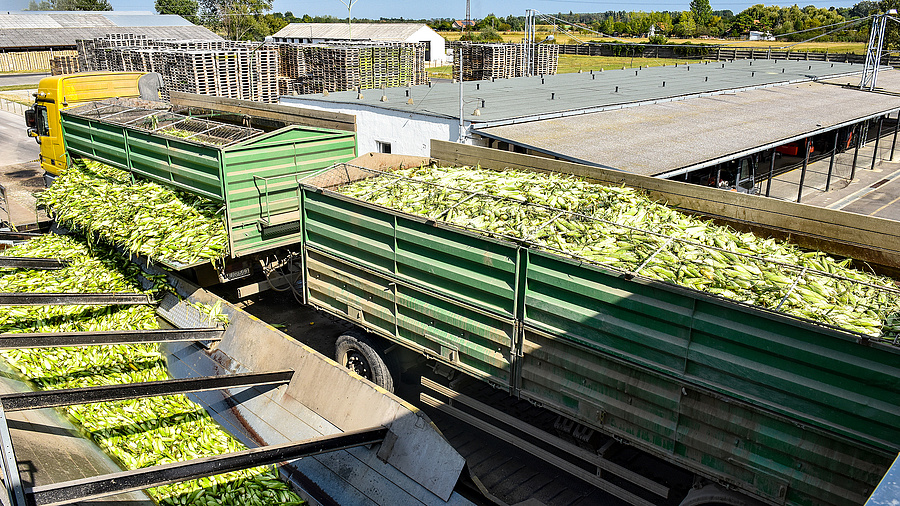 A teherautó bedönti a válogatásra szánt kukoricát a gyártási folyamba, ahol azt szortírozzák, megtisztítják, majd leszedik az értékes szemeket. Semmi nem megy pocsékba, ami hulladék marad, a kukoricaszemek leszedése után ismét hasznosul takarmányként, viheti is ugyanaz a teherautó, ami a csöveket hozta.