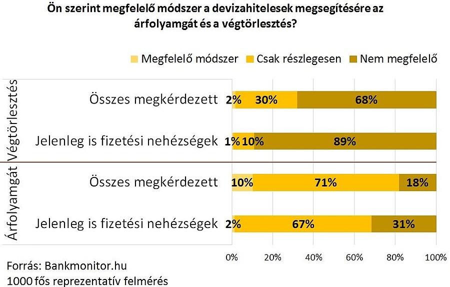 A megkérdezettek 68 százalék szerint a végtörlesztés nem volt megfelelő módszer a nehéz helyzetben lévő devizahitelesek megsegítésére, ugyanis az intézkedés elsősorban nem azokon segített, akik valóban rászorultak, hanem azokon, akik az igénybe vételhez elegendő szabad forrással rendelkeztek. Harminc százalék szerint csak részlegesen volt eredményes a program, és mindössze a megkérdezettek 2 százaléka tartja egyértelműen jó megoldásnak a végtörlesztést. "A végtörlesztés elutasítottsága azok körében a legmagasabb, akik jelenleg is fizetési gondokkal küzdenek, 90 százalékuk szerint nem volt hasznos az intézkedés" - mutatott rá Sán dorfi Balázs, a Bankmonitor.hu ügyvezetője.