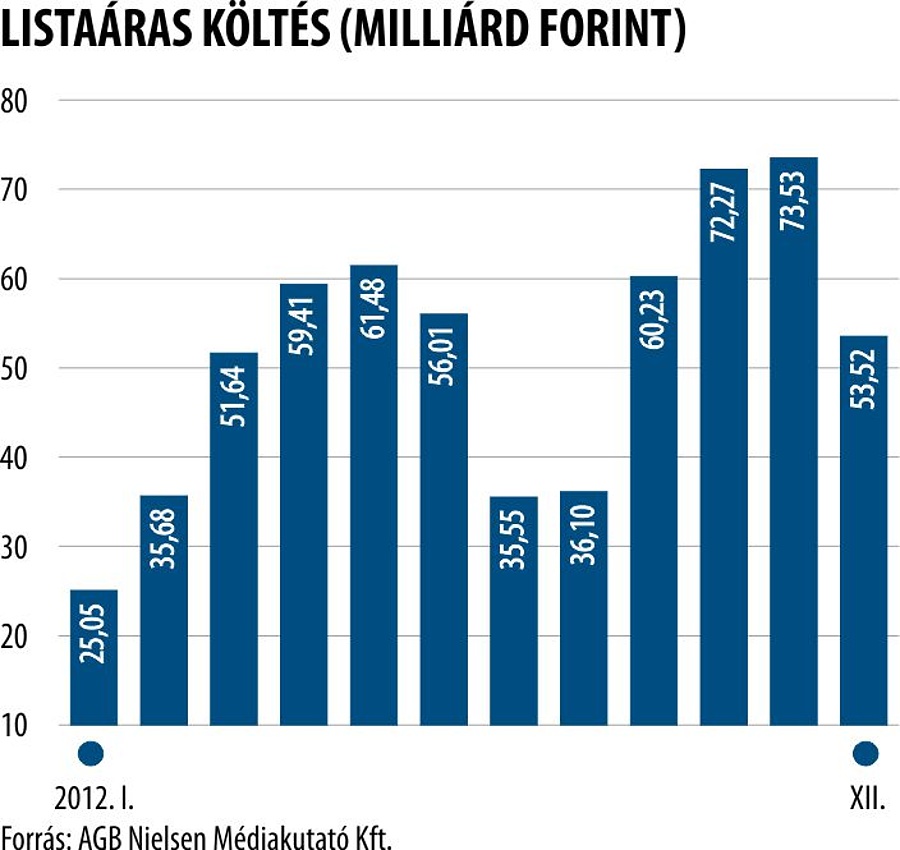 Egy néző (a teljes lakosságból) havonta átlagosan 1700 reklámot, éves szinten több mint 20 ezer reklámot látott, míg a kereskedelmi szempontból "értékesebb" közönség, vagyis a 18−49 éves korosztály körében 1429 reklámot néztek meg egy-egy hónapban, éves szinten pedig csaknem 17 ezret. Az AGB Nielsen adatai szerint − kedvezményektől mentesen − a listaáras reklámköltés 620 milliárd forint volt 2012-ben, míg a megelőző évben 588,7 milliárd forint. Az elmúlt évben a piac novemberben érte el a csúcsot, amikor 73,5 milliárd forint bevétel keletkezett, a leggyengébb hónap pedig január volt, 25,4 milliárd forintos költéssel. Ez a tendencia jellemezte a 2011-es évet is.