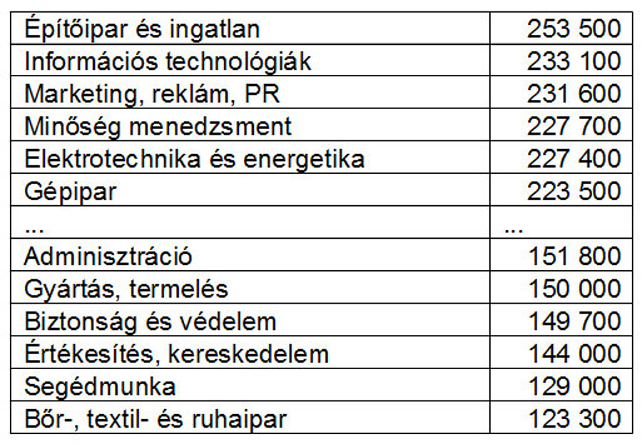 A Workania azt is megnézte, hogy mely szektorban kérnek többet a dolgozók. A kutatás érdekessége, hogy a bőr-textil és ruhaipar, valamint a segédmunkák mellett az értékesítés és kereskedelem területén kérik átlagosan a legkevesebbet a dolgozók. Ezen a területen viszont elég gyakori a havi fix fizetés mellett a teljesítmény alapú elszámolás. Havi nettó 150 ezer forint körüli a bérigény továbbá a gyártás-termelés, a biztonság és védelem, valamint az adminisztráció területén. A legmagasabb fizetési elvárások az építőipar, a információs technológiák, valamint marketing, reklám, PR területére jelentkező pályázóknál mutatkoztak.
