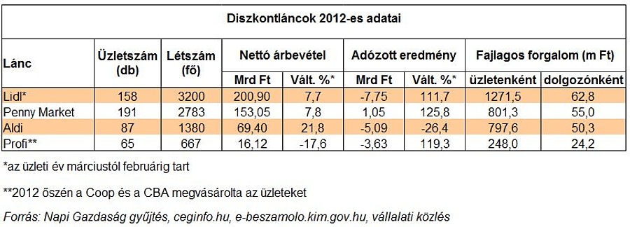 A várakozásoknak megfelelően megőrizte első helyét a hazai diszkontláncok között a Lidl Magyarország Bt. - derül ki a Céginfo.hu összeállításából. A közel 8 százalékos bevételnövekedés mellett - ami 200 milliárd forintot meghaladó forgalmat jelentett - ugyanakkor a duplájára, 7,7 milliárd forintra nőtt a vesztesége és látványosan csökkent saját tőkéje is a 2012 február végén zárult üzleti évben. A társaság az adatok hivatalos, július végére várható publikálása előtt nem kívánta részletezni a veszteségnövekedés és a tőkecsökkenés okait. Az viszont az alábbi összehasonlító táblázatból is jól látszik, hogy a hazai diszkontpiacon fajlagosan a Lidl-boltok és dolgozók termelik a legnagyobb forgalmat, bár a bevételnövekedés tempója jócskán elmaradt a konkurens Aldiétól. (A diszkontláncok tavalyi teljesítményéről részletesen itt olvashat.)