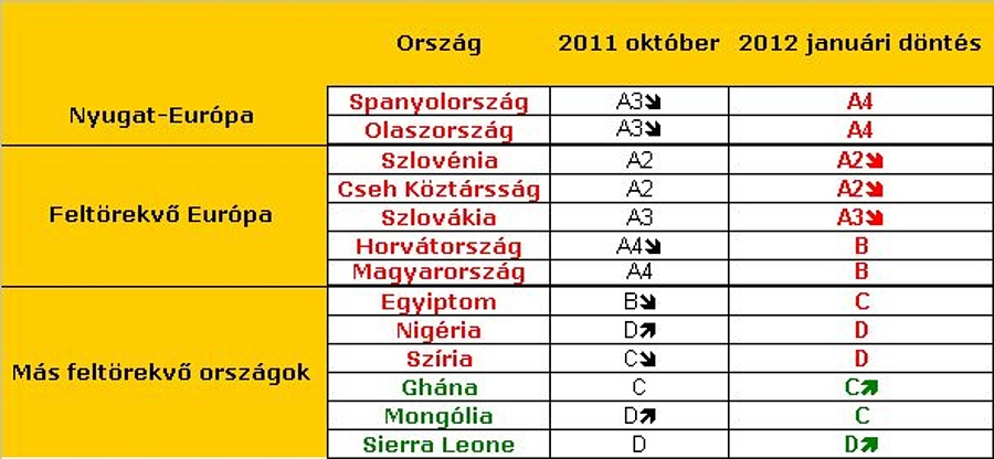 A nyitott gazdaságok növekedése megfeleződik: a tavalyi 4,1 százalék helyett az idén 2 százalékos lesz. A Cseh Köztársaság és Szlovénia A2-es, s Szlovákia A3-as besorolását negatív megfigyelés alá vonta a Coface. Magyarország iránt nő a befektetői bizalmatlanság, s a Coface B-re minősítette le. Horvátország leminősítésének (B) az oka részben az olasz kockázatoknak való kitettsége, részben pedig a gyenge gazdasági aktivitás, ami az árfolyamsokknak köszönhető.