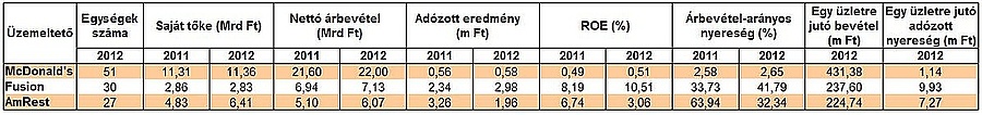 A McDonald's Magyarországi Étterem Hálózat Kft. 2012-ben az inflációtól elmaradó mértékben, közel 2 százalékkal 22 milliárd forintra növelte nettó árbevételét. Adózott eredménye több mint kétszer ekkora tempóban 58,2 millió forintra emelkedett. A lánchoz 98 étterem tartozott, ebből 47 franchise-üzemeltetésben, 51 pedig saját egység, a társaság által közölt számok ez utóbbiak teljesítményét tükrözik. A saját tőke a 2011. évi eredmény elszámolása miatt 11,36 milliárd forintra emelkedett. A beszámolóhoz csatolt mellékletben a kft. elismeri, hogy a működés és a gazdálkodás eredményessége üzemi szinten nagy mértékben lecsökkent, az anyagjellegű ráfordítások összegének növekedése miatt - e soron 15,49 milliárd forint szerepel, ami 2011-hez viszonyítva 4 százalékos pluszt jelent.