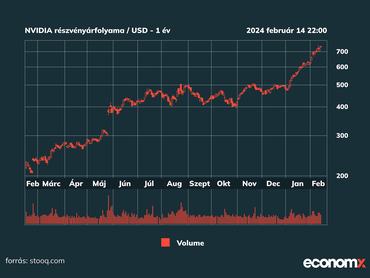 Tavaly egész évben erősen emelkedett a Nvidia részvénye, miután ismert lett, hogy a társaság gyártja főként azokat a chipeket, melyeket a mesterséges intelligencia alkalmazását kiterjesztő cégek kifejezetten erre a célra vásárolnak.