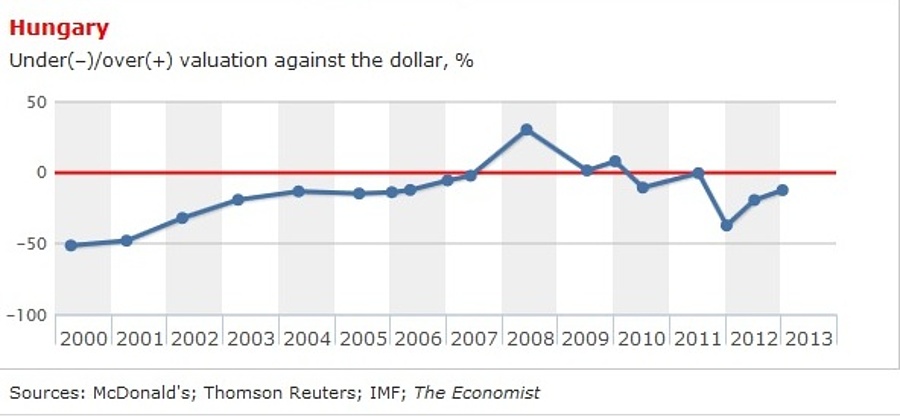 Az Economist által minden évben elkészített úgynevezett Big Mac-indexe 830 forintos Big Mac árral számolt, ami 3,82 dolláros összegnek felel meg az USA-ban regisztrált 4,37 dollárral szemben. Ez azt jelenti az index szerint, hogy a forint a dollárral szemben 12,6 százalékos, az euróval szemben 21,8 százalékos alulértékeltséget mutatott januárban.