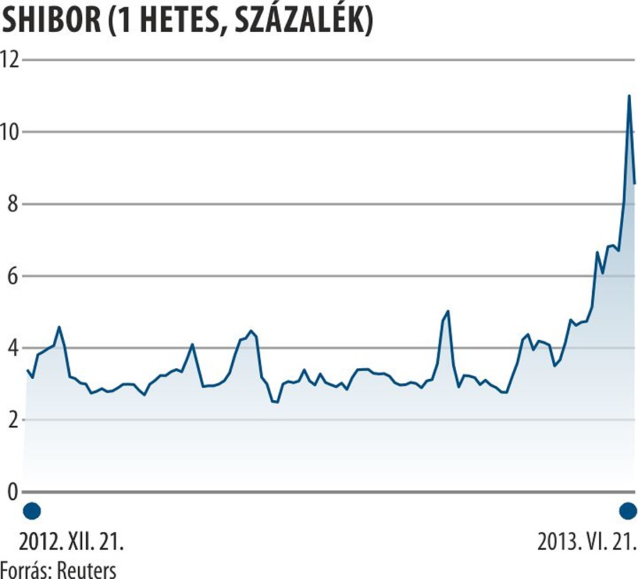 A problémák miatt a bankok már egymásban sem bíznak, akárcsak 2008 őszén az USA-ban és Európában, a kínai bankközi kamat, a Shibor néhány nap alatt többszörösére emelkedett, pénteken az ország jegybankja is kénytelen volt beavatkozni, rövid futamidejű hitelt kínált a bankoknak, hogy pótolja a bankközi piacon hiányzó bizalmat, a hírek szerint 58 milliárd dollárnyi kölcsönt öntöttek a piacra. Az akció után a bankközi piac kicsit megnyugodott, a hétnapos bankközi hitelek kamata a 11,62 százalékos csúcsról 9,29 százalékra esett, de az elemzők szerint ennél erőteljesebb beavatkozásra lesz szükség, hogy teljesen lecsillapodjanak a kedélyek. A héten ugyanis ismét megugorhat a bankközi kamat, mivel a pénzintézeteknek a negyedév végi finanszírozási szükségleteik miatt még több forrásra lesz szükségük.