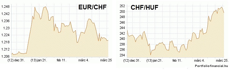 A Reuters beszámolója emlékeztet arra, hogy az elmúlt hetekben erősödésnek indult a svájci deviza, miután az eredménytelen olaszországi választások és a ciprusi válság eszkalálódása elbizonytalanította a befektetőket. Január végén a keresztárfolyam még megközelítette az 1,25-ös szintet, majd jó néhány cikkcakkal tarkítva 1,2180 alá került. Ez és a hazai deviza euróhoz mért gyengülése eredményezte azt, hogy a frank forintjegyzése az év eleji 235 körüli mélypontról 252-ig emelkedett, illetve most is közel van a 250-es szinthez.