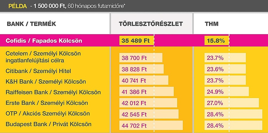 A Cofidis Magyarországi Fióktelepe alávetette magát a lakosság részére hitelt nyújtó pénzügyi szervezetek ügyfelekkel szembeni tisztességes magatartásáról szóló Magatartási Kódexnek. A Cofidis Fapados Kölcsön termékénél 1 500 000 Ft hitelösszeg esetében a teljes visszafizetendő összeg 2 129 340 Ft, a hitel teljes díja 629 340 Ft. 2 000 000 Ft és 60 hónapos futamidő esetén a THM 15,8%, a teljes visszafizetendő összeg 2 839 140 Ft, a hitel teljes díja 839 140 Ft.