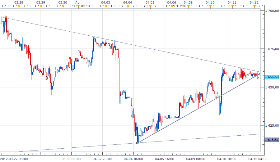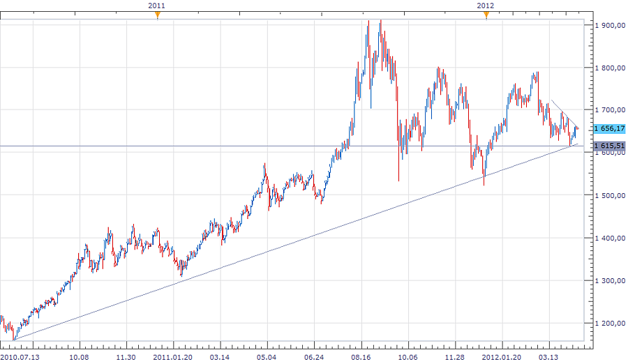 Ez a különleges, sárgán csillogó nemesfém az elmúlt néhány év hisztérikus árfolyam emelkedését már 10 hónapja korrigálja. Az elmúlt napokban igen komoly dilemma elé állította az árfolyam változása a befektetőket. Ugyanis az 1615-ös zóna közelében egy jelentős támaszszint alakult ki, melyet egy korábbi emelkedő trendvonal is alátámasztott. Az árfolyam innen visszapattant egészen egy rövidebb távú csökkenő trend tetejéig.