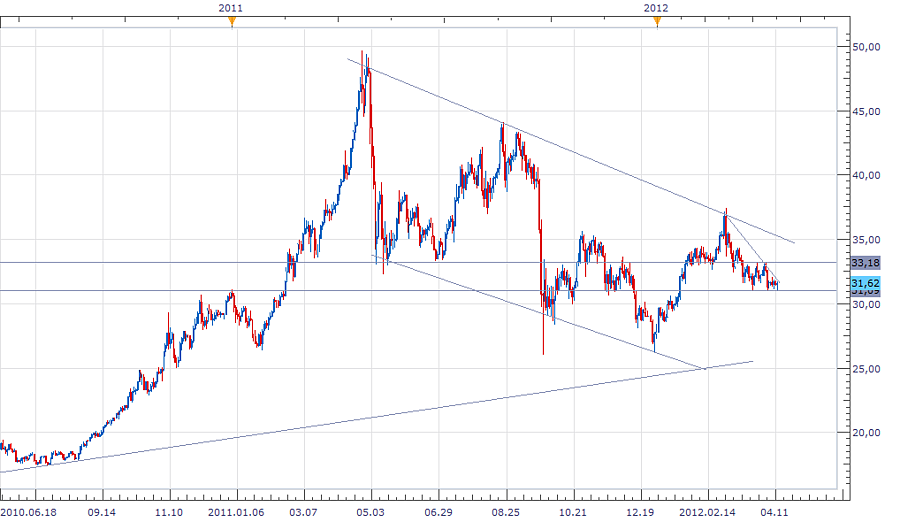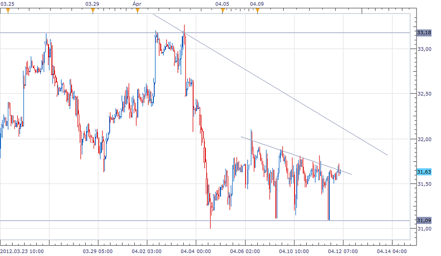 A rövidebb távon gondolkozóknak az órás grafikon nyújthat kiváló lehetőséget, ahol az ezüstöt fogságban tartja a 31 dolláros támaszszint, valamint a 6 napja tartó csökkenő trendvonal. Amennyiben innen kitör akár fölfelé, akár lefelé az árfolyam, akkor remek vételi, vagy eladási lehetőségeket kaphatunk. Vételi jelzés esetében érdemes figyelembe vennünk a napi grafikonon látható csökkenő trendvonal ellenálló hatását.