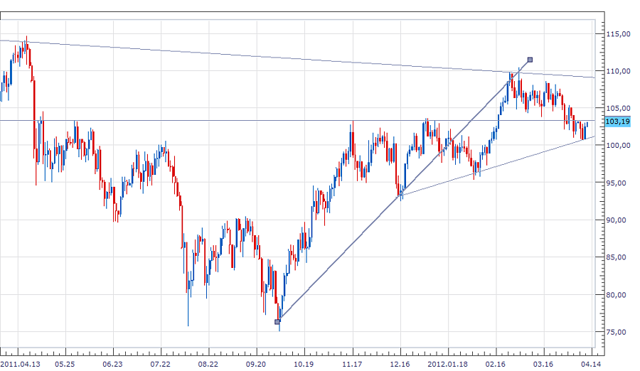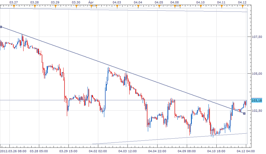 Az órás grafikonon az olaj kitört a csökkenő trendvonalából, amit vissza is tesztelt, miközben a 103 környékén elhelyezkedő ellenállásvonal megfogta az emelkedést. Amennyiben innen is kitör az árfolyam, vételi pozíció felvételét megfontolhatjuk.