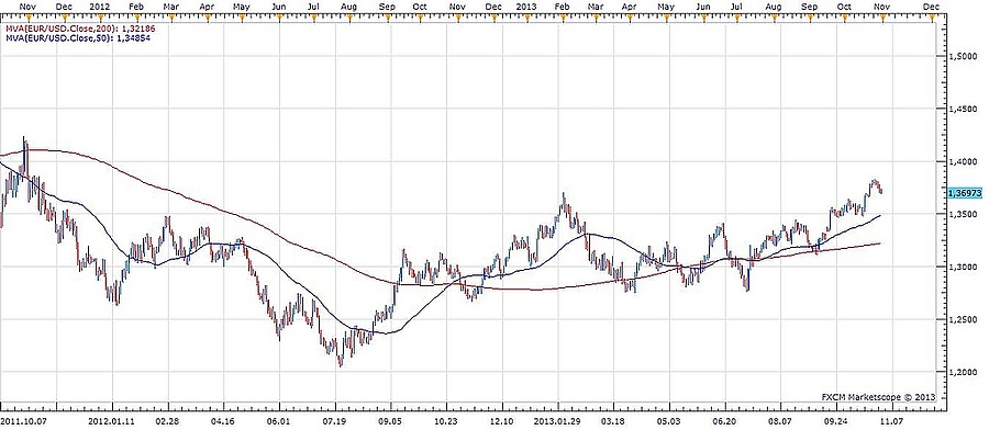 Nowotny szerint nem kell különösebben aggódni az euró dollárral szembeni felértékelődése miatt. Mint ismert, a közös deviza közel 3 százalékot erősödött a zöldhasúval szemben szeptember vége óta, amikor a Fed a kötvényvásárlások visszafogásának elhalasztásáról döntött. Szerinte ez a mozgás még bőven belefér a két deviza árfolyamában megszokott mozgások kategóriájába.