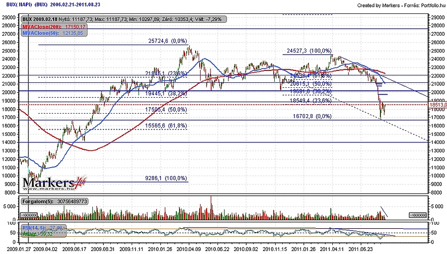 Az elmúlt évben meghatározó támaszként funkcionáló 20 200 pontos szint áttörése a várakozásoknak megfelelően hatalmas zuhanást indított el a Budapesti Értéktőzsdén, az esést csak a 2009 nyári csúcs jelentette támasz tudta megállítani. Az index innen pattant a múlt héten, azonban egyelőre konzervatívan semmilyen bizonyíték nincs arra, hogy a csökkenő trend véget ért volna a BÉT-en.
