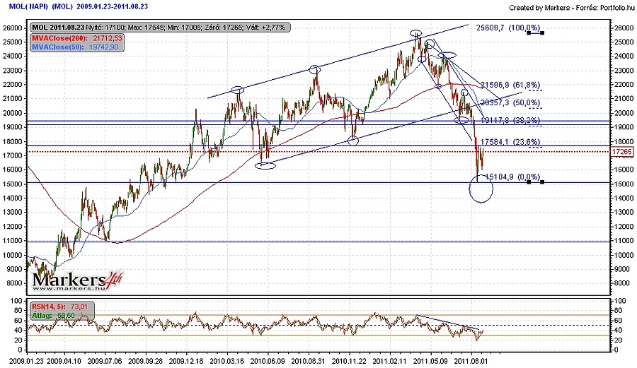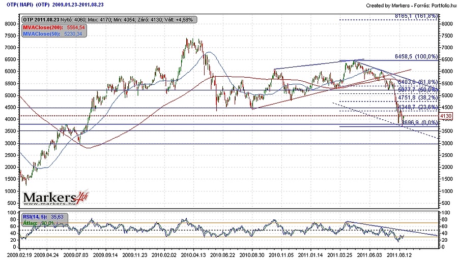 A vezető részvények közül az OTP-ről hasonló mondható el, mint az indexről. Trendfordító alakzat nincs, a trendhez tartozó RSI nem tört ki csökkenő trendjéből, az első optimizmusra okot adó jelet a 4450 forintos szint átütése jelentené. Spekulánsok számára a jelenlegi környezet kedvező, hiszen magasan vannak az erős ellenállási szintek - a legfontosabb is 5200 forint magasságában található, így felfelé is nagy a tér, s már lefelé is távol van az erős támasz zóna, 3700-3850 forint között. A bankrészvény korábbi emelkedő ék alsó szárának 5800 forint magasságában letört célját már 4300 forint körül teljesítette. Ha a közeljövőben törne a 3700-3850 forintos szint, akkor két tovább támasz található a grafikonon, az egyik 3500 és 3600 forint között az emelkedés 61,8 százalékos Fibonacci-szintje (dollárban számolva ez erős szint lehet), illetve a 2009. nyári mélypont, 3000 forint körül. A 4450 forintos szint átlépésével szintén Fibonacci-szintek, illetve a korábban letört 4800, majd 5200 forintos szintek jelenthetnek gátat a további felfelé mozgásban.