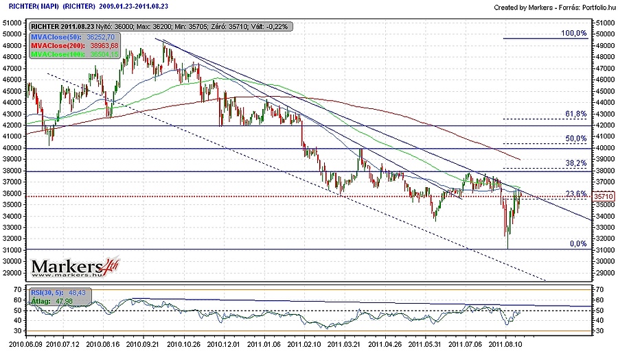 A Richter esetében a valamivel 31 000 forint felett kialakított új mélypont bizonyíték arra, hogy a csökkenő trendvonal törése nem a csökkenő trend fordulójára, hanem annak pihenésére volt jelzés. A papír képe középtávon elképesztően rosszul fest, bár rövidebb távon van még tér benne felfelé. Az első igazán komoly ellenállás 38 000 forinton várja a részvényt (most az újabb csökkenő trendvonal szoríja lefelé az árat), e feletti zárások esetén is azonban bőven lenne min izgulni, hiszen 39 000, 40 000 és 42 000 forinton is komoly akadályok tornyosulnak a részvény drágulása előtt. Ezen szintek áttörését valószínűleg csak egy komolyabb bázisépítés és erős trendfordító alakzat kiépülése után lehetne várni.
